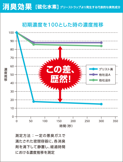 • グリーストラップから漂う複合臭を素早く消臭し、臭い戻りがありません。