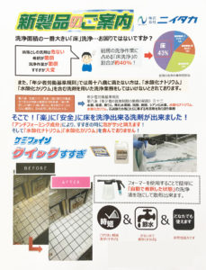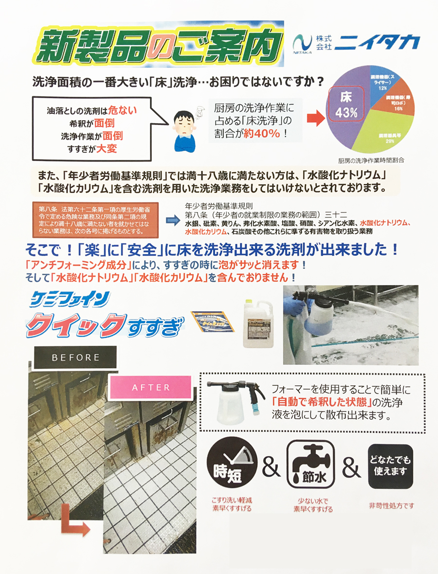 床洗浄の洗浄剤「ノンブラッシング効果」と「クイックすすぎ効果」のダブル効果で、時間短縮と高い仕上がりを実現するアルカリ洗浄剤。油汚れ用対応です。